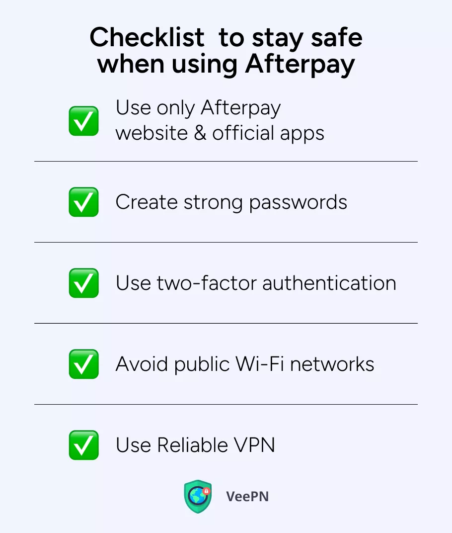 Afterpay 應用程序和平台遵循 PCI DSS,以確保在交易期間確保您的支付信息安全。他們藉助加密、安全網絡和定期安全審計來做到這一點。