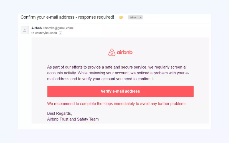 通常,詐騙者會使用此方案來竊取憑據,通過欺騙性鏈接將您帶到可疑網站。他們可能會嘗試使用一些常見的社會工程技術來欺騙您。例如,欺詐者可能會帶著緊迫感進行遊戲。愛彼迎電子郵件詐騙可能會試圖讓您相信,如果您不立即驗證密碼或電子郵件,您的帳戶將被封鎖。