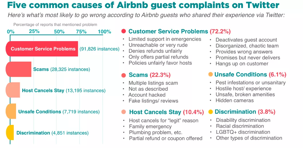 2021 年,著名數據科學家 Asher Fergusson 與其他研究人員合作,提出了一個詳細報告包含 Airbnb 客人在經歷不愉快經歷後在推特上發布的最常見投訴。除了客戶支持不滿意之外,用戶的擔憂還包括詐騙(例如虛假列表,欺騙性評論, 和帳戶被黑),意外取消住宿,不安全的情況, 和歧視。
