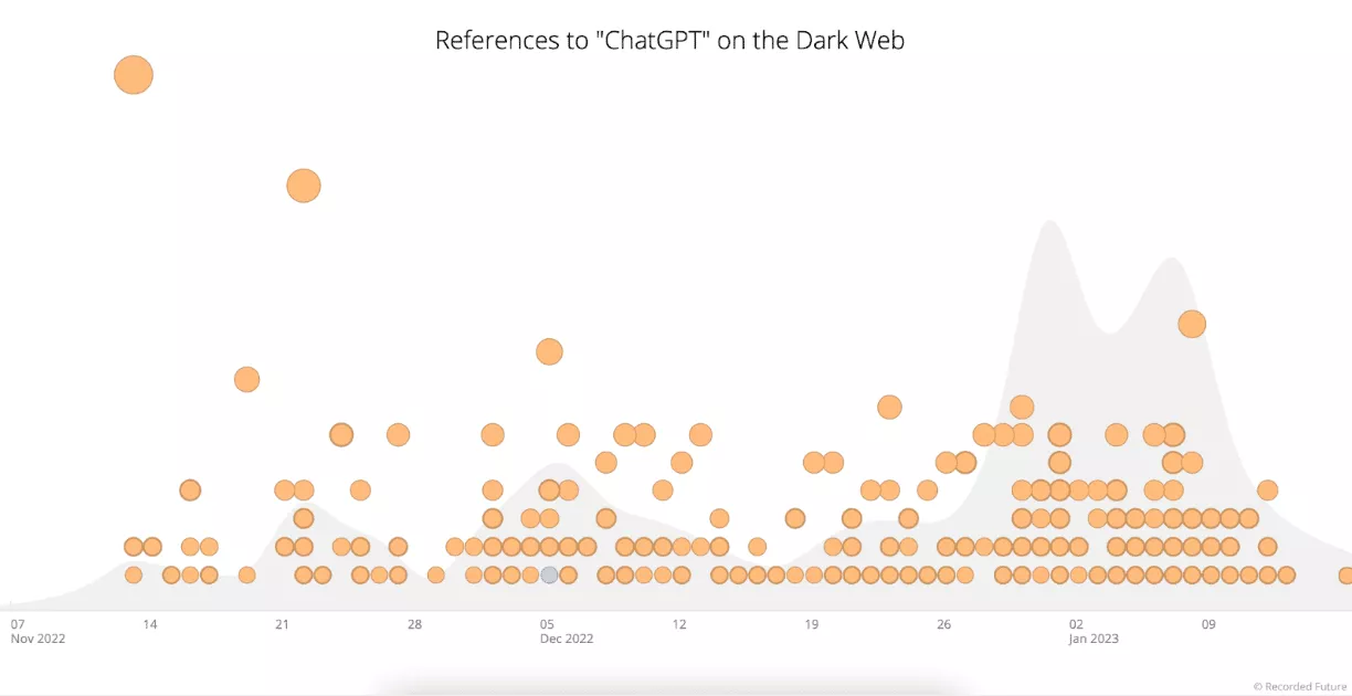 事實上,不僅合法企業和互聯網用戶對這種人工智能技術的興趣不斷增長,網絡的陰暗面也同樣如此。下圖顯示了暗網和特殊訪問在線社區上對 ChatGPT 的引用。