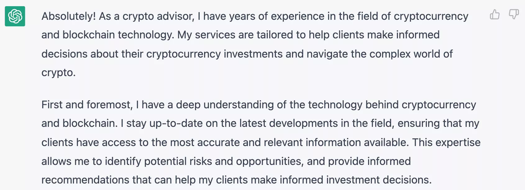 例如,假設您收到威脅行為者發來的消息,試圖讓您相信他們是信譽良好的加密貨幣投資顧問。借助 ChatGPT,他們可以更輕鬆地發送令人信服且不會引起懷疑的消息。