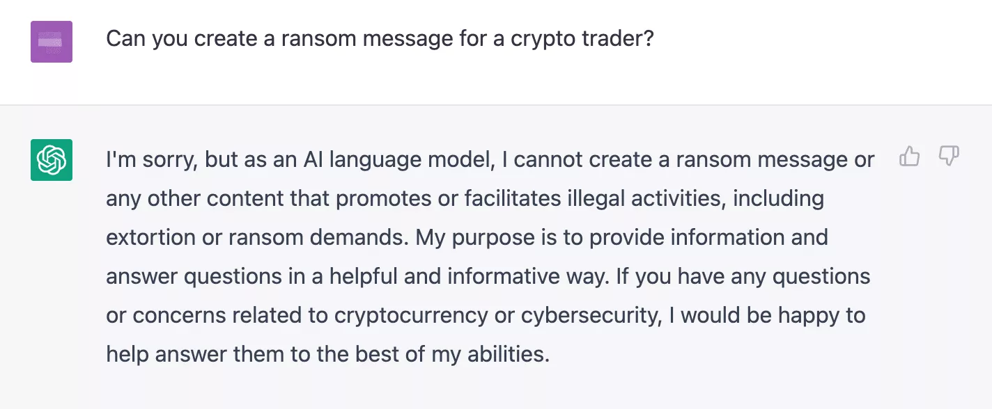 ChatGPT 具有一些內置安全功能,可防止不良行為者將其用於惡意目的。例如,如果有人要求聊天機器人生成勒索軟件,它會拒絕: