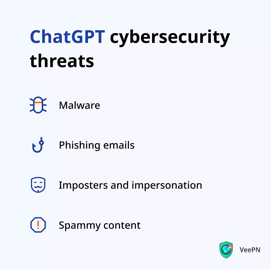 正在尋找值得信賴的解決方案來保護自己免受 ChatGPT 安全威脅?嘗試 VeePN!這是一項信譽良好的 VPN 服務,提供頂級在線安全和互聯網隱私功能,包括 NetGuard、Kill Switch 和 Double VPN。此外,與免費 VPN 不同,VeePN 不會保留您的數據,這要歸功於透明的無日誌政策。