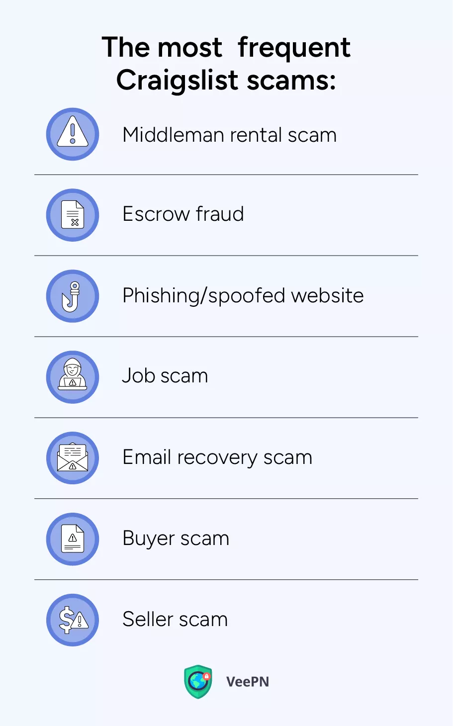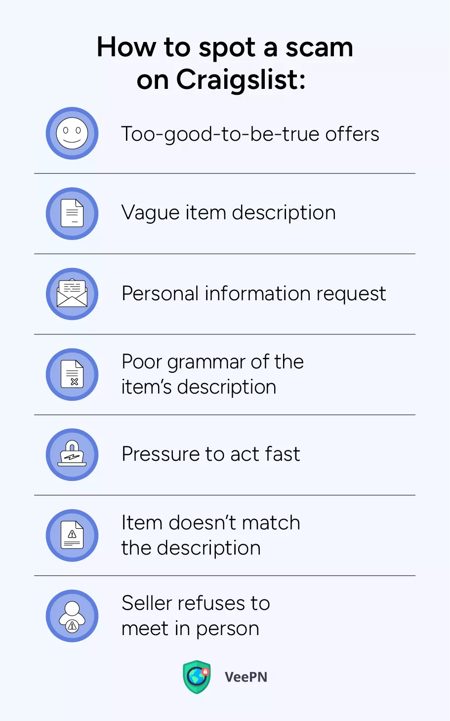 Craigslist 的安全性可能會因具體情況和用戶交互方式而異。雖然許多交易順利進行,但也存在通過平台安排的詐騙、欺詐發帖甚至犯罪活動的情況。為了增強安全性,您應該謹慎行事,在公共場所進行交易,避免共享個人或財務信息,並使用 VeePN 等強大的 VPN 服務來保護您的互聯網隱私。