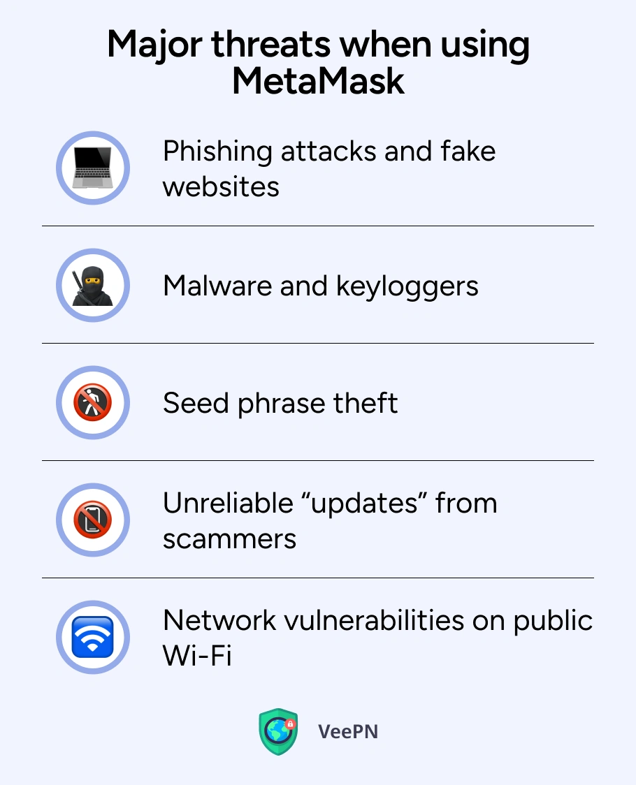 公共 Wi-Fi 網絡是黑客的金礦。在不安全的網絡上,攻擊者可以攔截數據、欺騙錢包活動或將惡意代碼注入您的連接。如果您在沒有保護的情況下在公共 Wi-Fi 上使用 MetaMask,則您將面臨遭受中間人攻擊的風險,這些攻擊可能會默默地批准交易或竊取登錄信息。