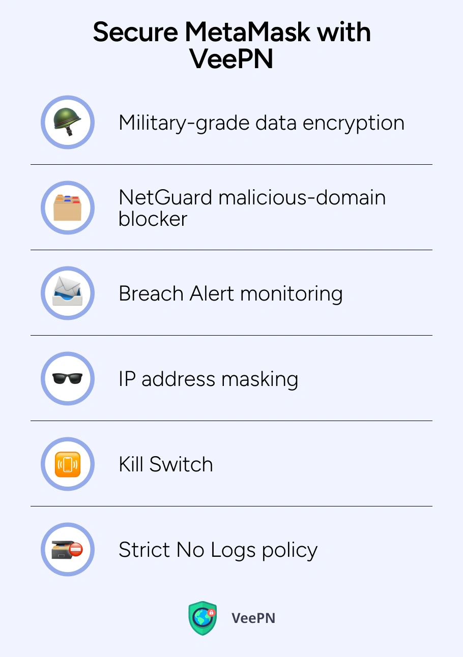 將 MetaMask 與 VeePN 配對可以通過添加額外的網絡安全層來使 MetaMask 更安全。它有助於保護您的交易和敏感信息免受潛在威脅。