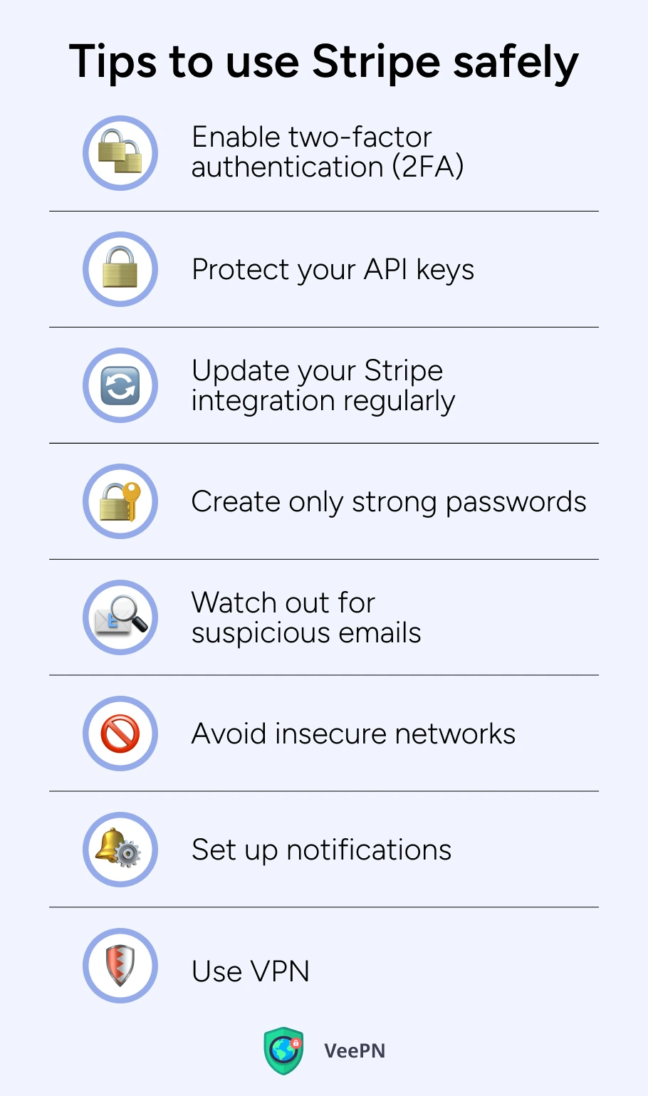 咖啡店和機場的公共 Wi-Fi 網絡並不安全,而且常常成為網絡犯罪分子的好盟友。如果您需要在此類位置登錄 Stripe 並訪問儀表板,請使用可靠的 VPN 連接來完成。 VPN 會隱藏您的 IP 地址並創建一個受保護的“隧道”來加密您的數據,從而使黑客無法看到這些數據。