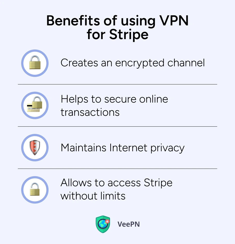 Stripe 是一個強大的支付系統平台,可幫助您處理在線商店或服務的付款。它使計費變得更容易,處理訂閱費用,並具有先進的安全功能來保護您的財務。用戶還可以從 VeePN 等 VPN 中受益,它可以保護個人詳細信息的私密性並阻止數字窺探。有了合適的 VPN,無論您身在何處,都可以更加放心地使用 Stripe。