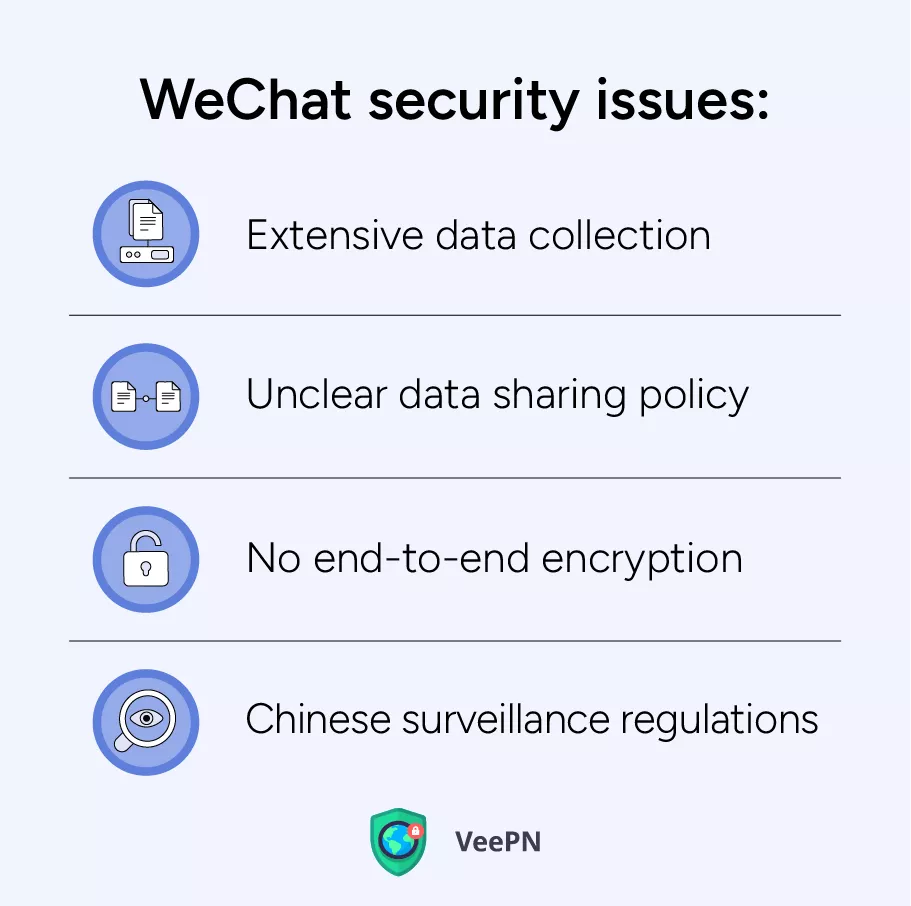 微信會引起許多隱私和安全問題,尤其是由於遵守中國法律而導致的數據收集和潛在的政府監視。您應該謹慎地分享敏感信息並利用可用的安全功能來減輕風險。另外,建議使用可靠的VPN應用程序(例如VeEPN)來保護您的個人數據。