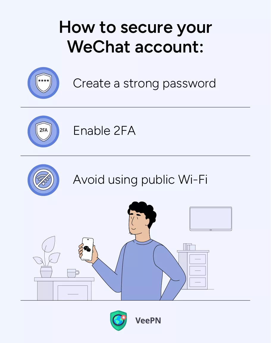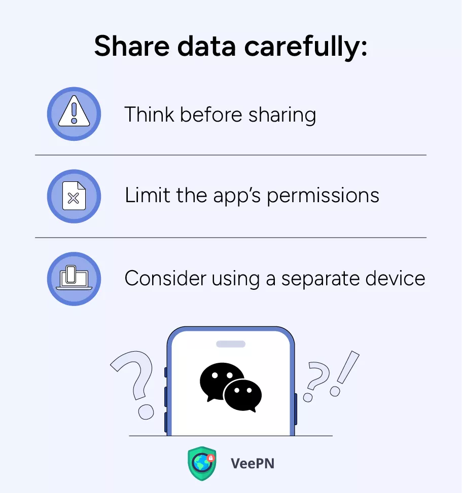 使用微信時,有三個主要考慮因素:確保您的個人資料,,,,仔細的數據共享, 和使用虛擬專用網絡(VPN)應用程式。讓我們回顧這些安全實踐中的每一種: