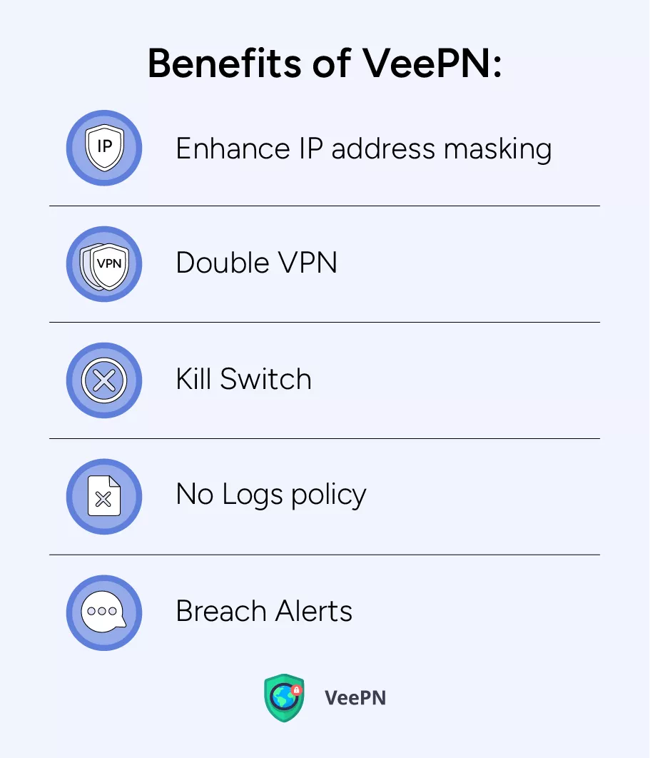 但是,我們需要警告您不要使用免費的VPN服務,因為它們通常向第三方出售用戶數據以賺取收入。相反,請嘗試像Veepn這樣的優質VPN應用程序,因為它提供了一系列安全功能: