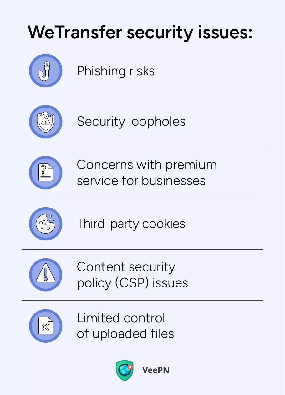 總體而言,WeTransfer 在保護用戶安全方面做得足夠。但這是否意味著根本沒有威脅呢?不幸的是,沒有。讓我們了解一下在使用 WeTransfer 服務之前您應該注意哪些安全問題。