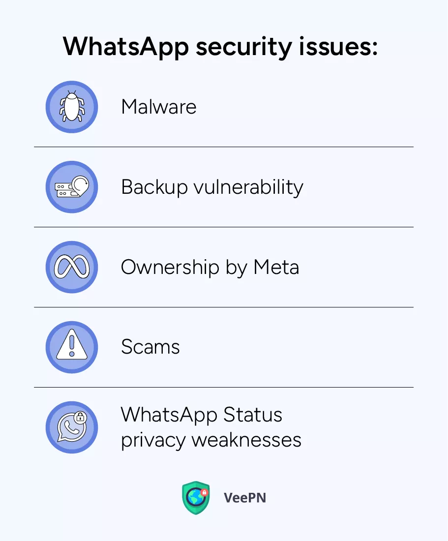 如前所述,WhatsApp 並不真正安全,因為使用此通訊程序可能會面臨各種隱私威脅: