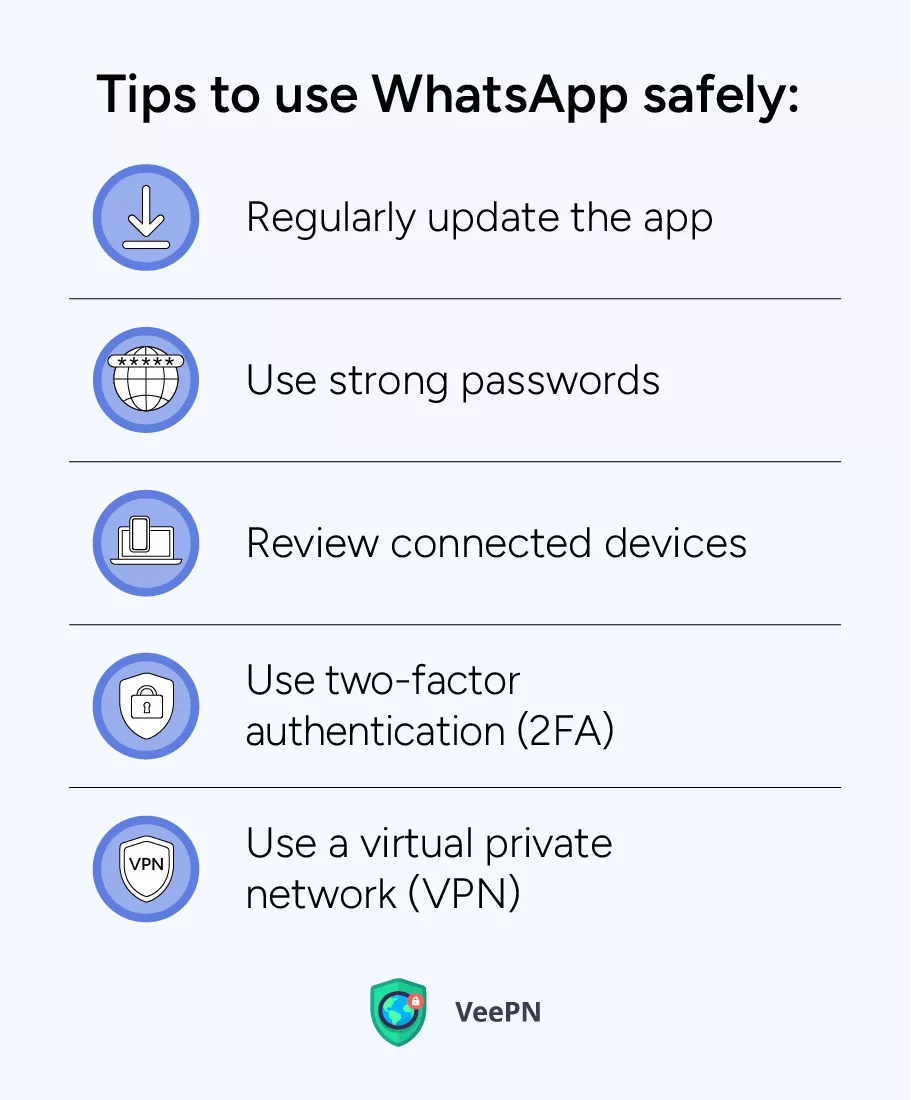 由於該應用程序的端到端加密確保只有您和收件人才能閱讀消息,因此某人不太可能監視您的 WhatsApp 消息。但是,存在潛在的漏洞,例如您的設備上存在惡意軟件或未經授權訪問您的帳戶。保持您的設備和 WhatsApp 應用程序更新且安全至關重要,並使用 VeePN 等可靠的 VPN 服務來最大程度地降低您的隱私風險。