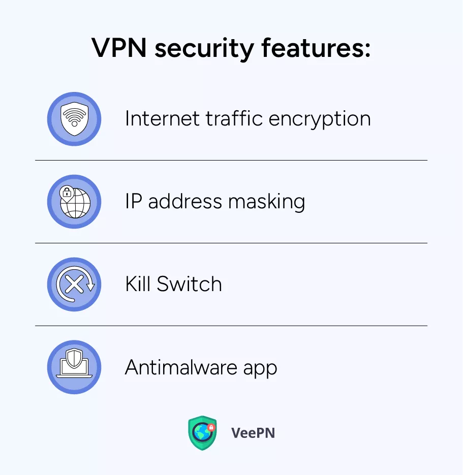可靠的 VPN 應用程序始終配備一系列安全功能來保護您的敏感信息。它們是: