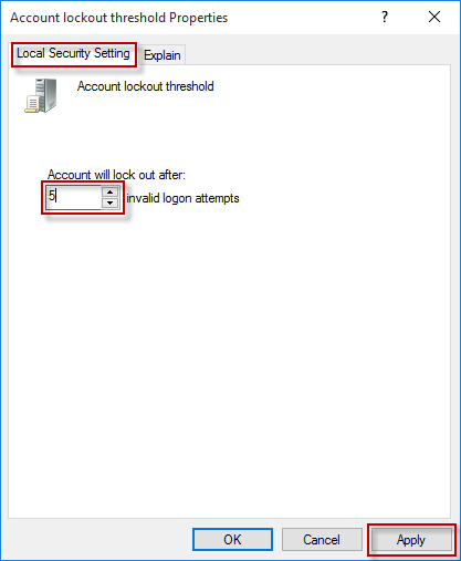 步驟5:您會收到提示,“帳戶鎖定持續時間”項和“重置帳戶鎖定計數器”項的設置將更改為建議值(30 分鐘),單擊好的,然後單擊好的再次。如果需要,您可以將建議值更改為您想要的值。