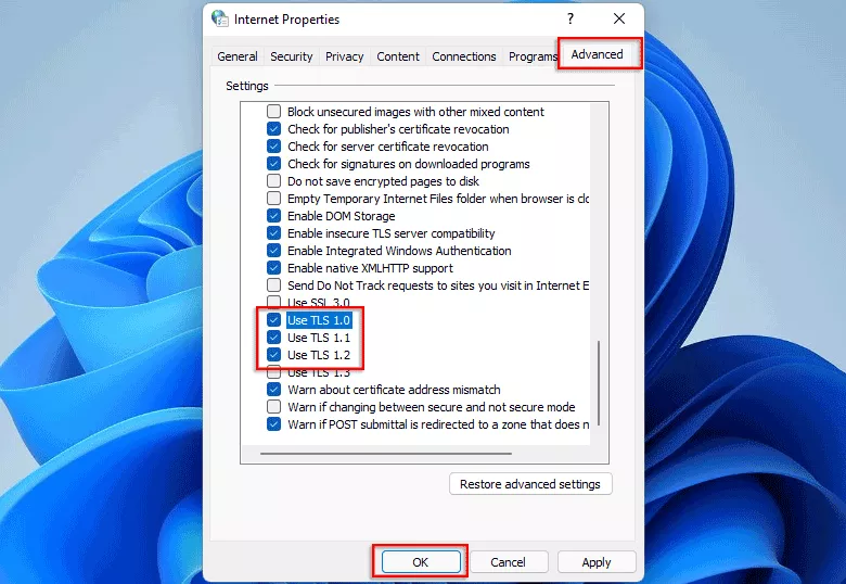 步驟2:切換到先進的選項卡並檢查使用 TLS 1.0,使用 TLS 1.1,