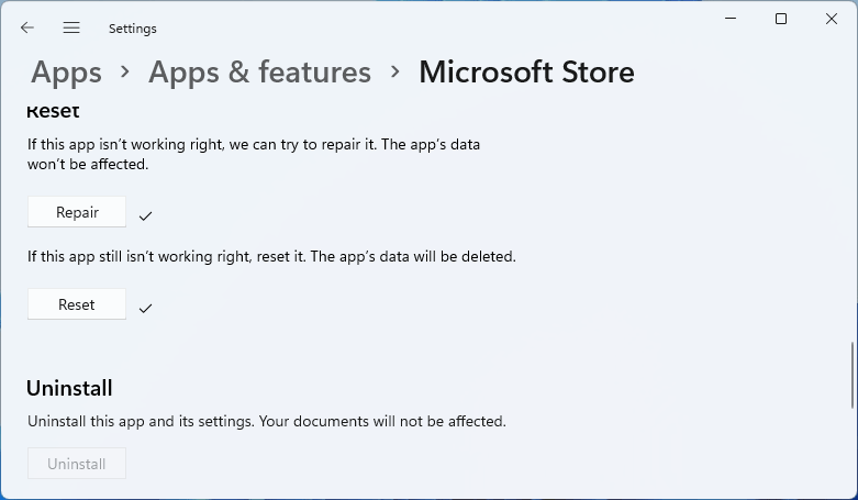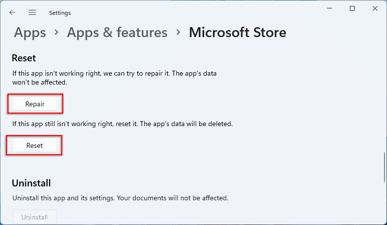 解決方案 6:修復並重置 Microsoft Store 以修復 Microsoft Store 無法工作的問題