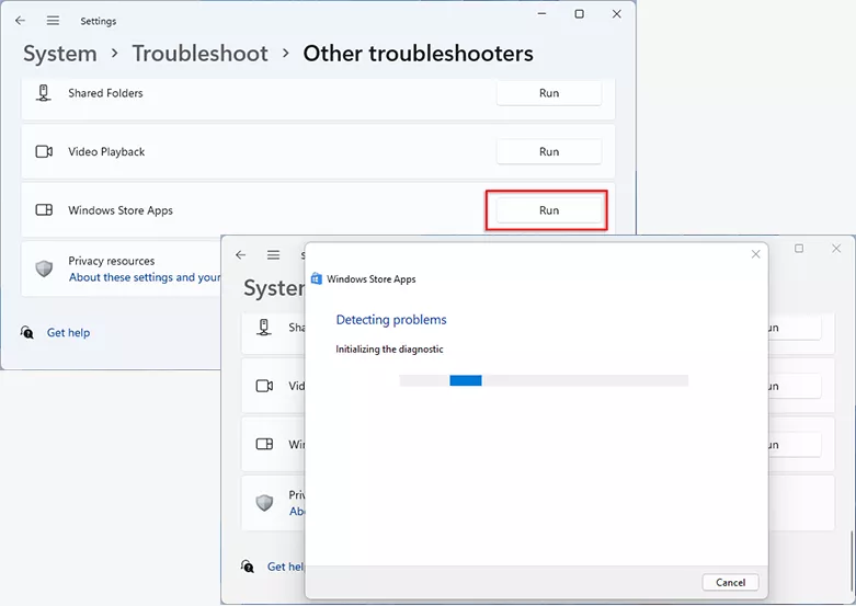 第4步:選擇跑步在 Windows 應用商店應用程序中,然後程序將開始檢測