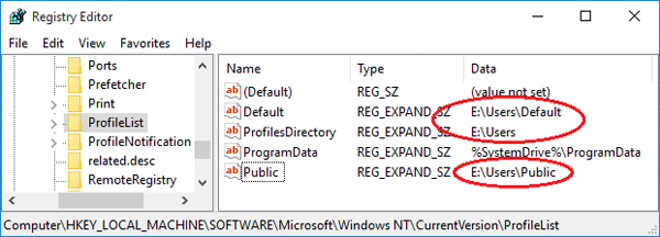 - 在右側窗格中,我們需要修改以下條目的值:Default、ProfilesDirectory 和 Public。將 %SystemDrive%\Users 替換為新的配置文件目錄,例如 E:\Users。修改值後,它應該如下圖所示。