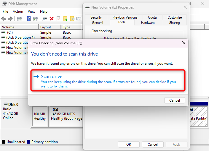 讓 Windows 掃描驅動器。如果 Windows 發現錯誤,它將嘗試自動修復這些錯誤或讓您知道未發現錯誤。