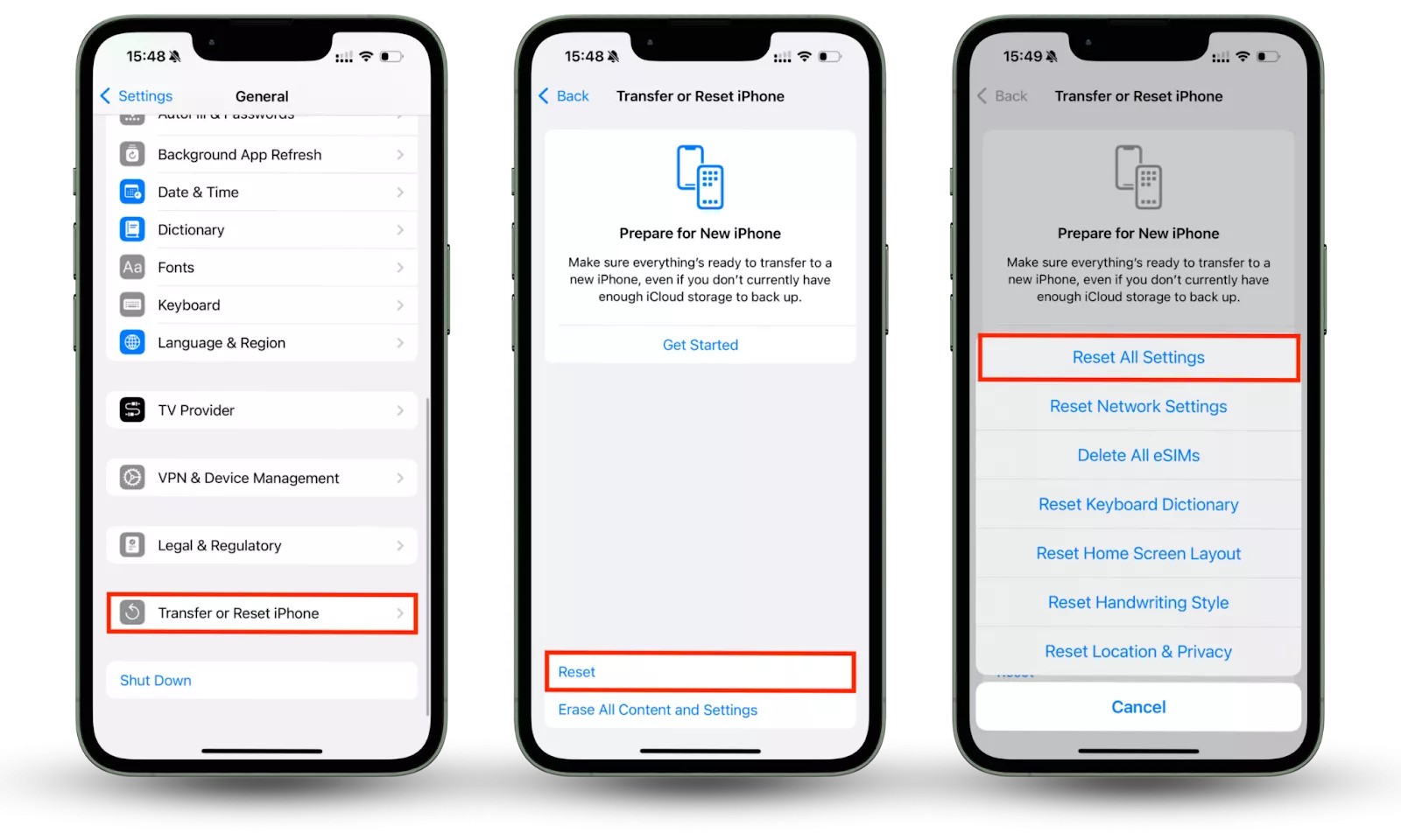 - 前往設置 > 通用 > 傳輸或重置 iPhone > 重置 > 重置所有設置。