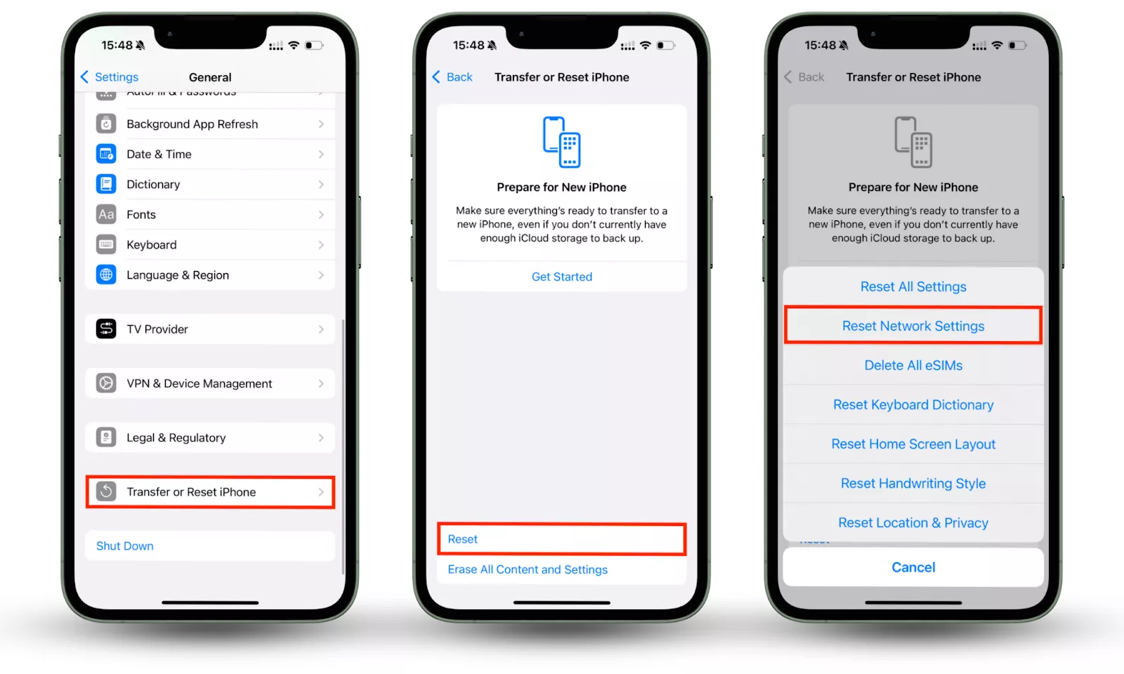 - 前往設置 > 通用 > 傳輸或重置 iPhone > 重置 > 重置網絡設置。