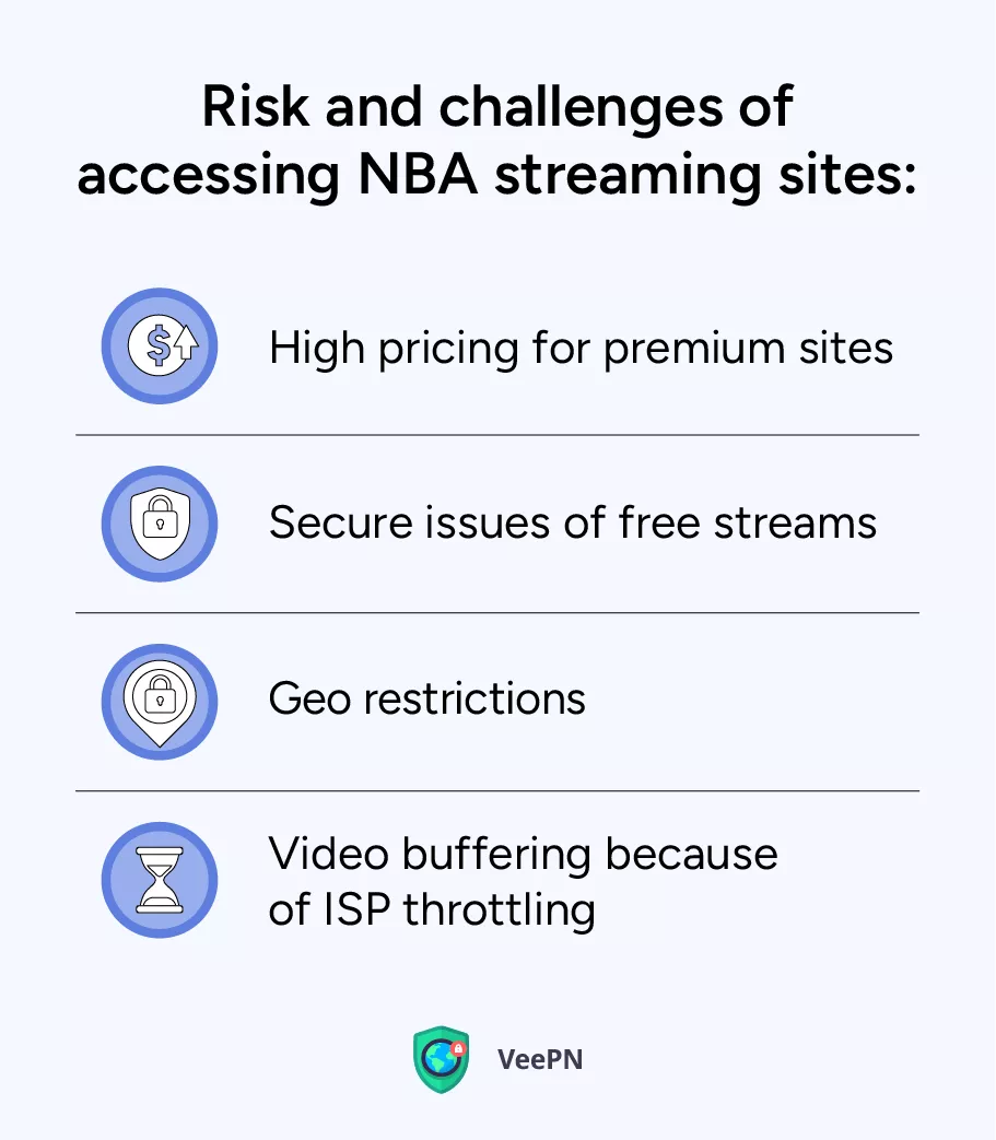 儘管上述平台被認為是直播 NBA 比賽的最佳網站,但訪問它們仍然會帶來不同的風險和挑戰,您必須注意。讓我們看一下它們並討論如何解決它們。