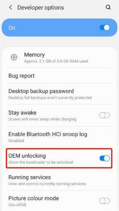 啟用“OEM解鎖”選項可以防止FRP鎖在添加Google帳戶後重新打開。要啟用它,