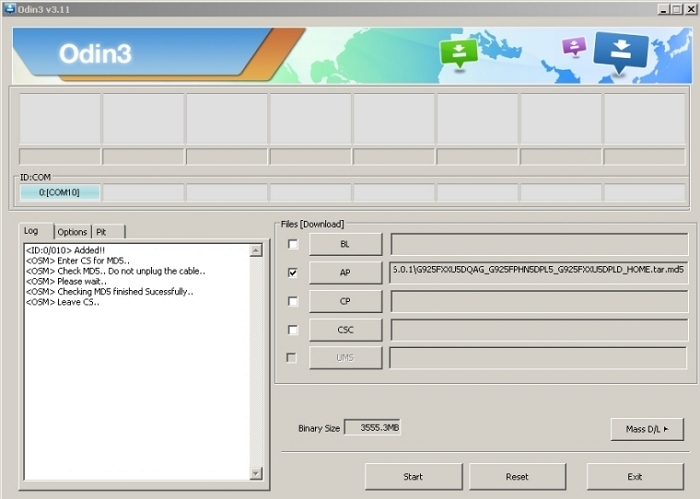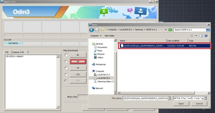 第4步:在Odin中,按“AP”按鈕並選擇FRP重置固件文件。在 Odin 的“選項”選項卡中,確保僅選擇“自動重新啟動”和“F.重置時間”選項。