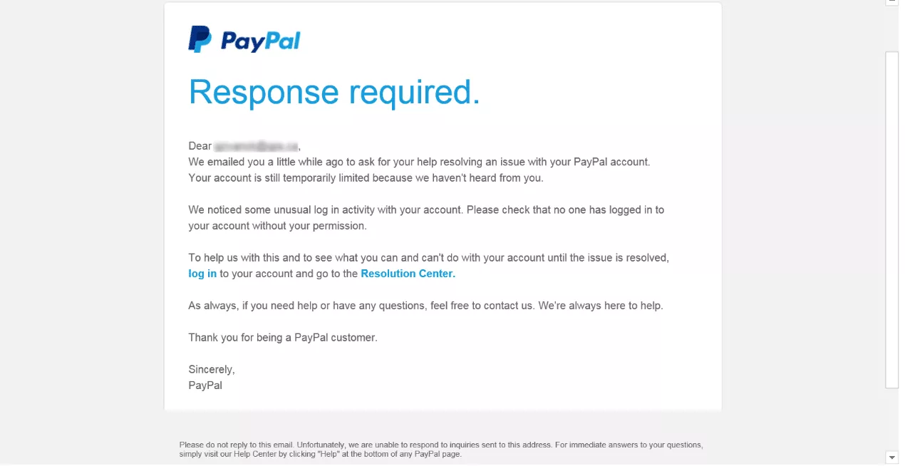 - “您的帳戶有問題。”讓網絡釣魚受害者上鉤的另一種常見方法是嚇唬他們或讓他們感到緊張。例如,圖像電子郵件試圖讓收件人相信他們的 PayPal 帳戶經歷了“不尋常的登錄活動”。