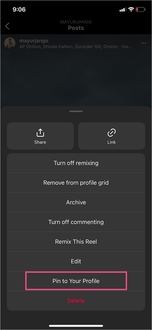 現在,讓我們看看如何通常將捲軸固定在Instagram配置文件中,以及捲軸中沒有“ PIN pin to Your Profile”選項。