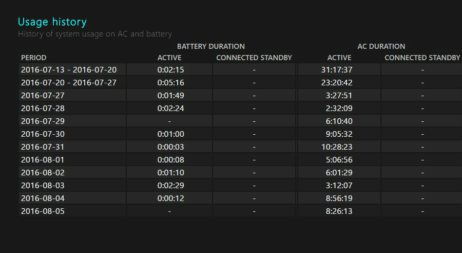 電池報告看起來不那麼令人討厭,並且包含有關日常電池使用情況的信息。它顯示過去三天的最近使用統計數據和圖表、系統每週活動時間的電池使用歷史記錄以及每週電池容量歷史記錄,以了解與原始容量相比已消耗了多少。