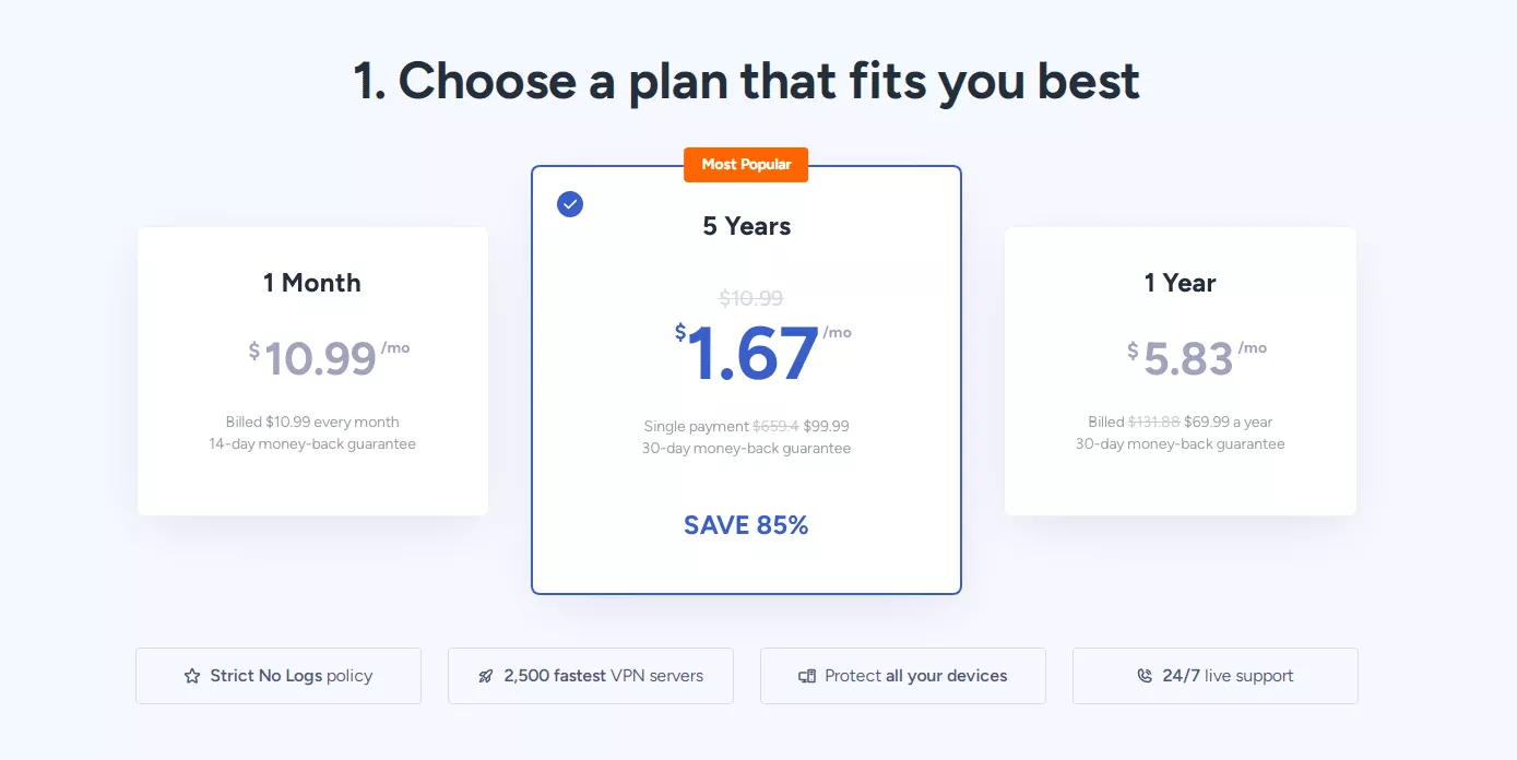 最後但並非最不重要的一點是,雖然 VeePN 不提供免費版本,但它有一些實惠的優惠,其中最好的優惠是1.67$/月如果你有一個長期計劃。所有計劃的功能都是相同的。您也可以使用信用卡、PayPal、支付寶、PaymentWall 和加密貨幣付款。