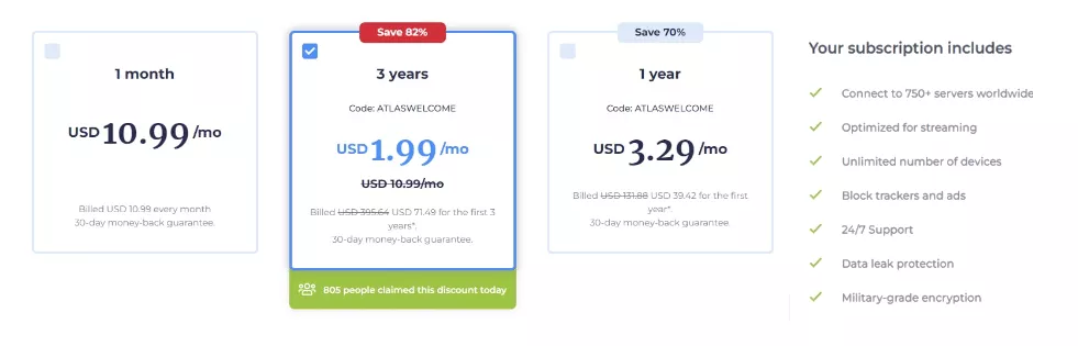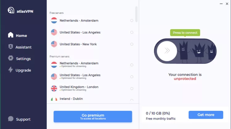 但是,與質子類似,Atlas VPN 也提供免費版本。當然,也包括限制。對於免費計劃,您有 10 GB 的數據限制,這不適用於流式傳輸大文件,並且只能訪問三個位置。此外,免費版本不允許您訪問流媒體優化服務器、24/7 支持、無限並發連接和安全瀏覽功能。