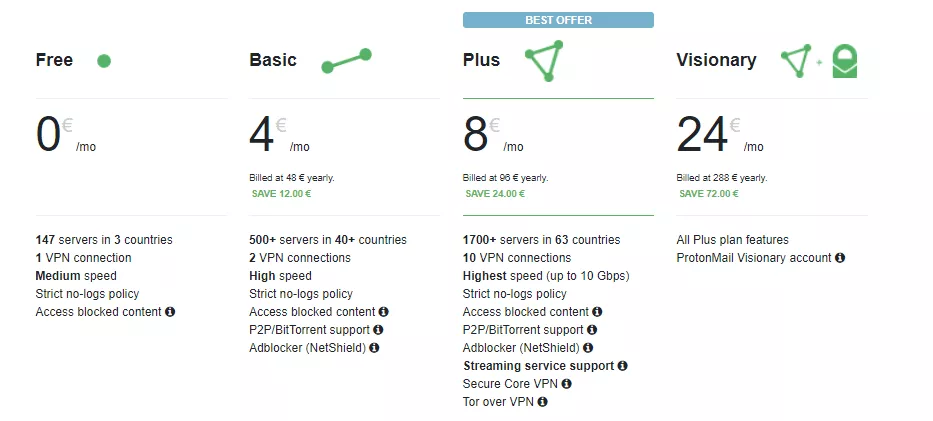 正如我們之前提到的,ProtonVPN 提供免費版本,但在功能方面與付費版本有很大不同。產品的最佳報價是plus 計劃每月 8 美元,每年收費 96 美元。它提供廣泛的服務器網絡、10 個並發連接、最高的速度和關鍵的安全功能,例如網盾、安全核心 VPN,以及其他。
