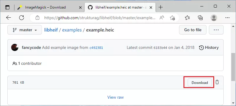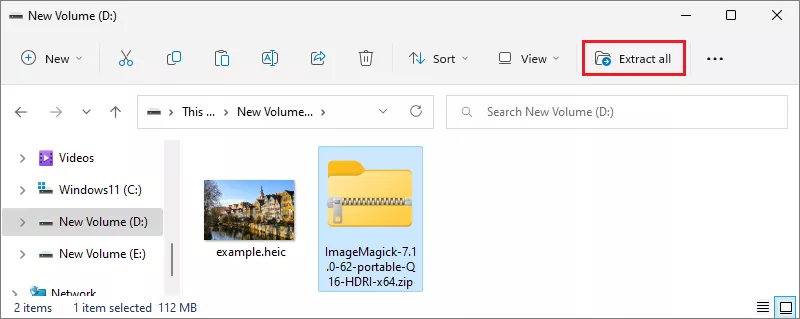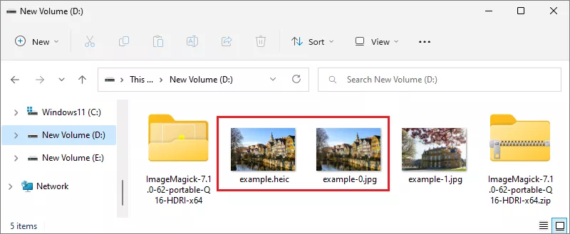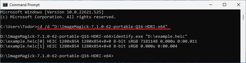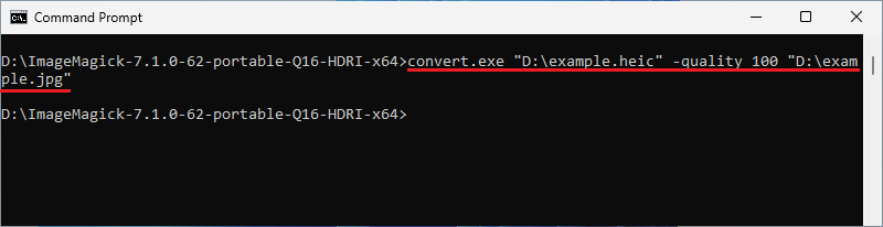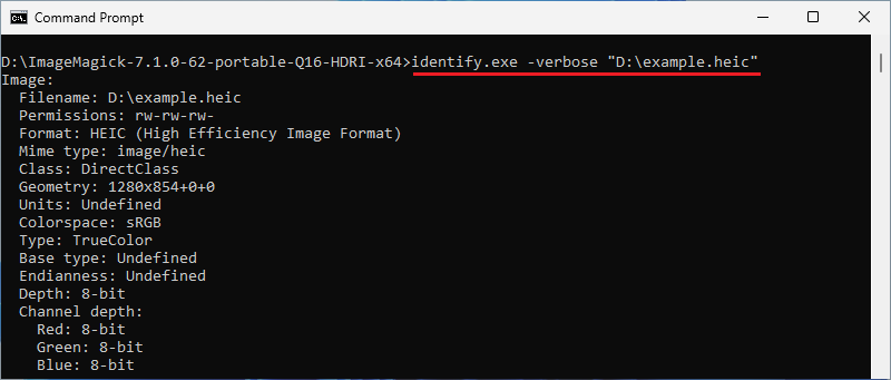 尖端:在這種情況下,我在D驅動器上下載並保存了ImageMagick。此外,還有一張名為“ example.heic”的照片也保存在D驅動器上。