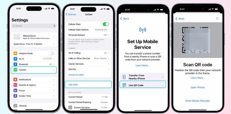 例如,您可以掃描運營商的二維碼或下載他們的應用程序並註冊計劃。僅此而已。您的手機將下載 eSIM 配置文件,並且您的連接將立即開始。