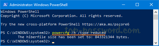 此命令將減少休眠文件大小,僅存儲操作系統內核和快速啟動驅動程序。如果您收到錯誤“參數不正確”,請嘗試先使用以下命令解壓縮休眠文件powercfg /h /大小 0,然後再次運行上面的命令。