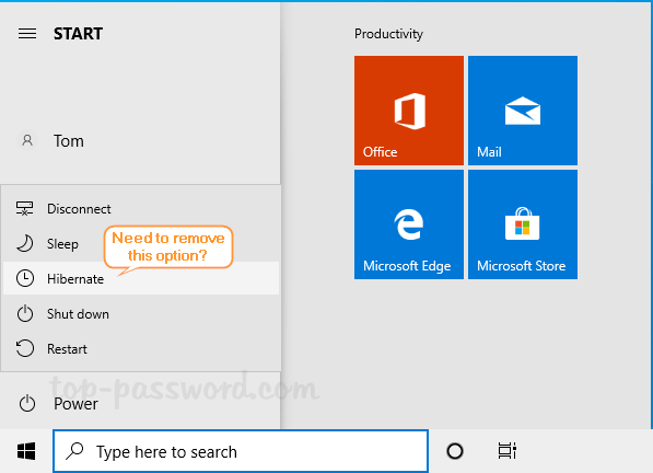 現在,打開“開始”菜單並單擊力量圖標,你會發現休眠選項被刪除。