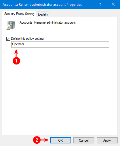 8. 啟用策略設置和輸入新名稱你想給管理員帳戶。