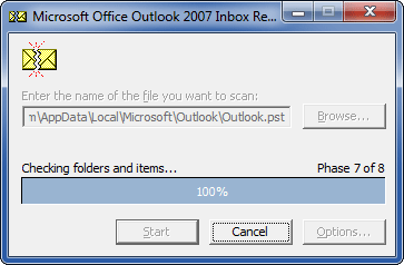 - 單擊開始按鈕進行掃描。此時,您的 pst 文件不會發生任何變化。 Scanpst 將首先進行分析。此分析由 8 個階段組成,其中一些階段可能需要比其他階段更長的時間才能完成,具體取決於文件的大小和損壞程度。
