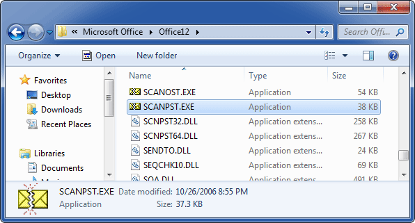 - 打開 Windows 資源管理器,然後找到 scanpst.exe 文件。在我的示例中,它位於此文件夾 C:\Program Files (x86)\Microsoft Office\Office12\ 中。