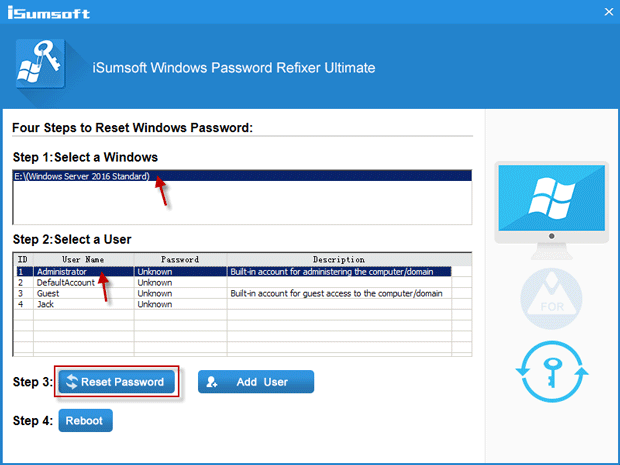 1)在Windows密碼Refixer屏幕,選擇設備上運行的Windows Server 2016,選擇需要重置密碼的本地或域管理員帳戶,然後單擊重置密碼按鈕。