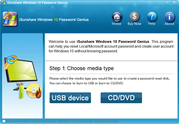 當一切準備就緒後,您需要安裝並運行iSunshare Windows 10 密碼天才在可訪問的 Windows 計算機上。同時,將刪除設備插入電腦並使其被識別。之後,在軟件界面上選擇設備類型:USB設備或CD/DVD-ROM。
