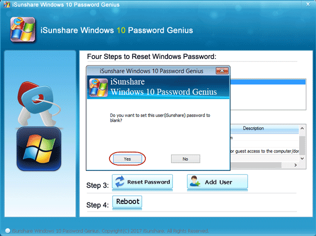 2.選擇本地帳戶(或 Microsoft 帳戶)從用戶列表中,點擊重置密碼和是的按鈕。 Windows 10 本地帳戶密碼將立即重置。