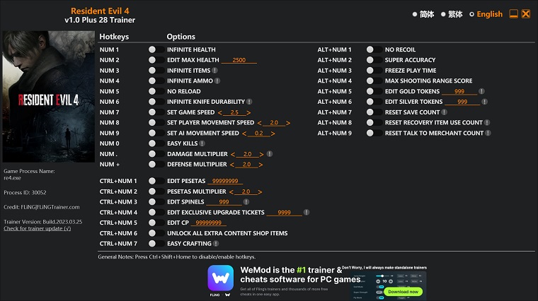 一扔是《生化危機 4 重製版》中另一位受歡迎且可靠的作弊訓練師。該訓練師還提供 28 個作弊選項,其中包括: