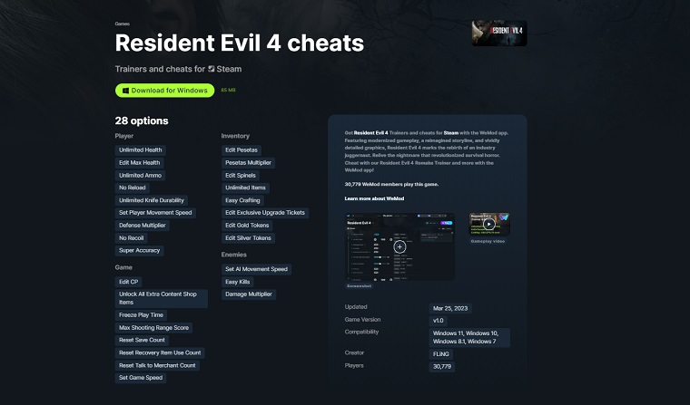 維摩德是最好的作弊訓練師,您可以下載它來激活遊戲中的上帝模組。 WeMod Trainer 在《生化危機 4》中提供了 28 個作弊選項。無論您玩的是 Steam 還是非 Steam 遊戲,WeMod 都支持。您不需要花一毛錢來激活任何作弊。