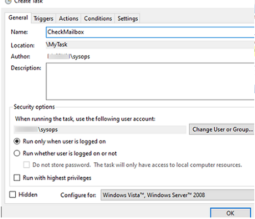 Run only the task is logged in) - 或用戶是否已登錄(Run whether user is logged on or not)。第二種模式最常使用。在第二種情況下,您可以指定任務應代表特定用戶(用於存儲用戶密碼的憑據管理器)運行。如果任務需要高程,請啟用'擁有最高特權' 選項。