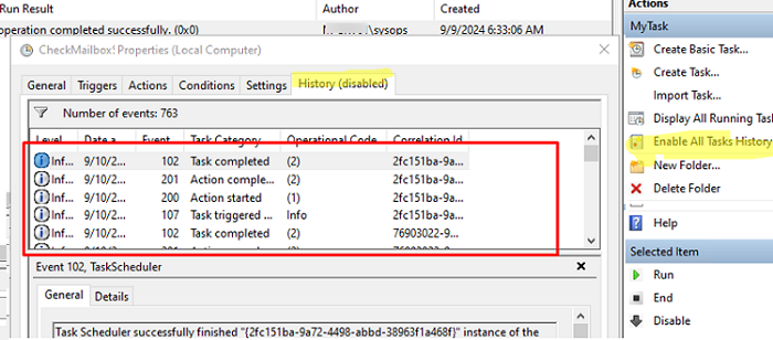 - 使用歷史選項卡以查看以前任務的歷史記錄和結果。默認情況下,任務記錄並未保存在任務調度程序中(單擊啟用所有任務歷史記錄鏈接在動作窗格中)。